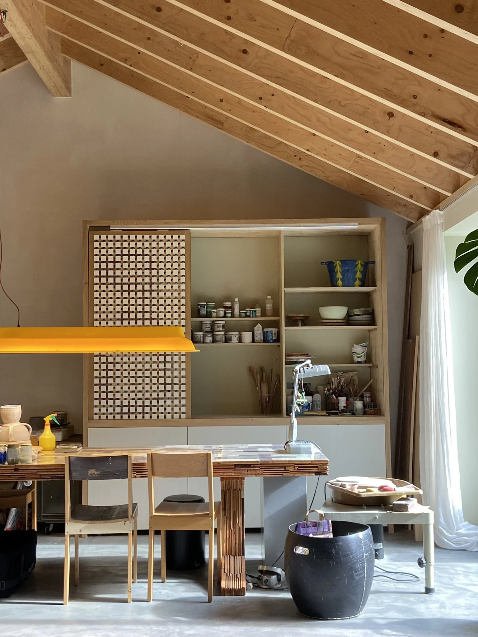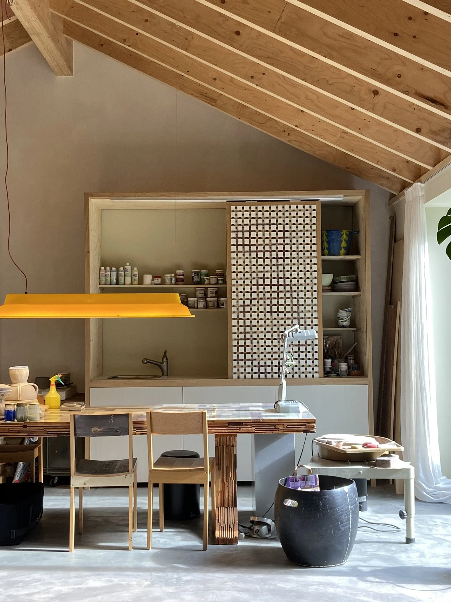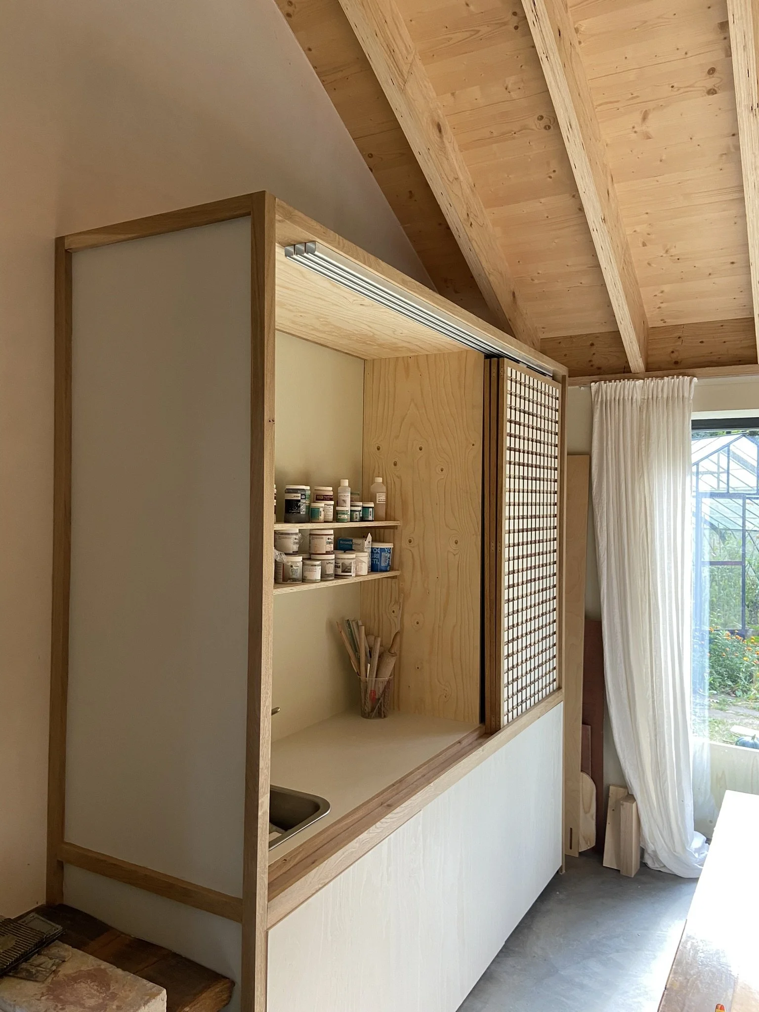 De kast is uitgerust met een geïntegreerde spoelbak en een werkblad, waardoor hij ook functioneert als compacte werkplek of atelierunit. De schuifpanelen zorgen voor een rustige aanblik wanneer de kast gesloten is en maken het mogelijk om flexibel te schakelen tussen werken en opbergen.