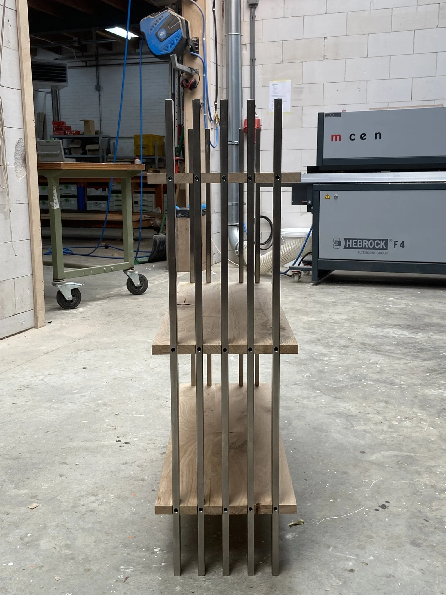 Deze open kast is een eigentijdse variant op de eiken lattenkast, waarbij warm massief eikenhout wordt gecombineerd met koel roestvrijstaal. De ranke RVS staanders zorgen voor een grafisch lijnenspel dat zowel structuur als openheid geeft aan het meubel. De kast voelt ruimtelijk, maar is tegelijk stevig en precies opgebouwd.