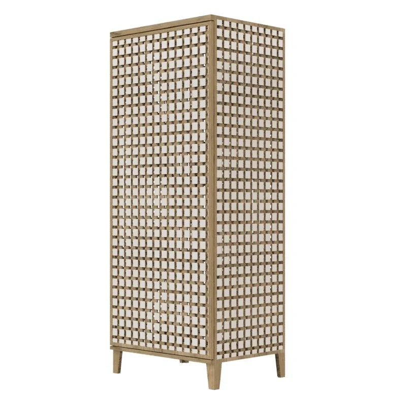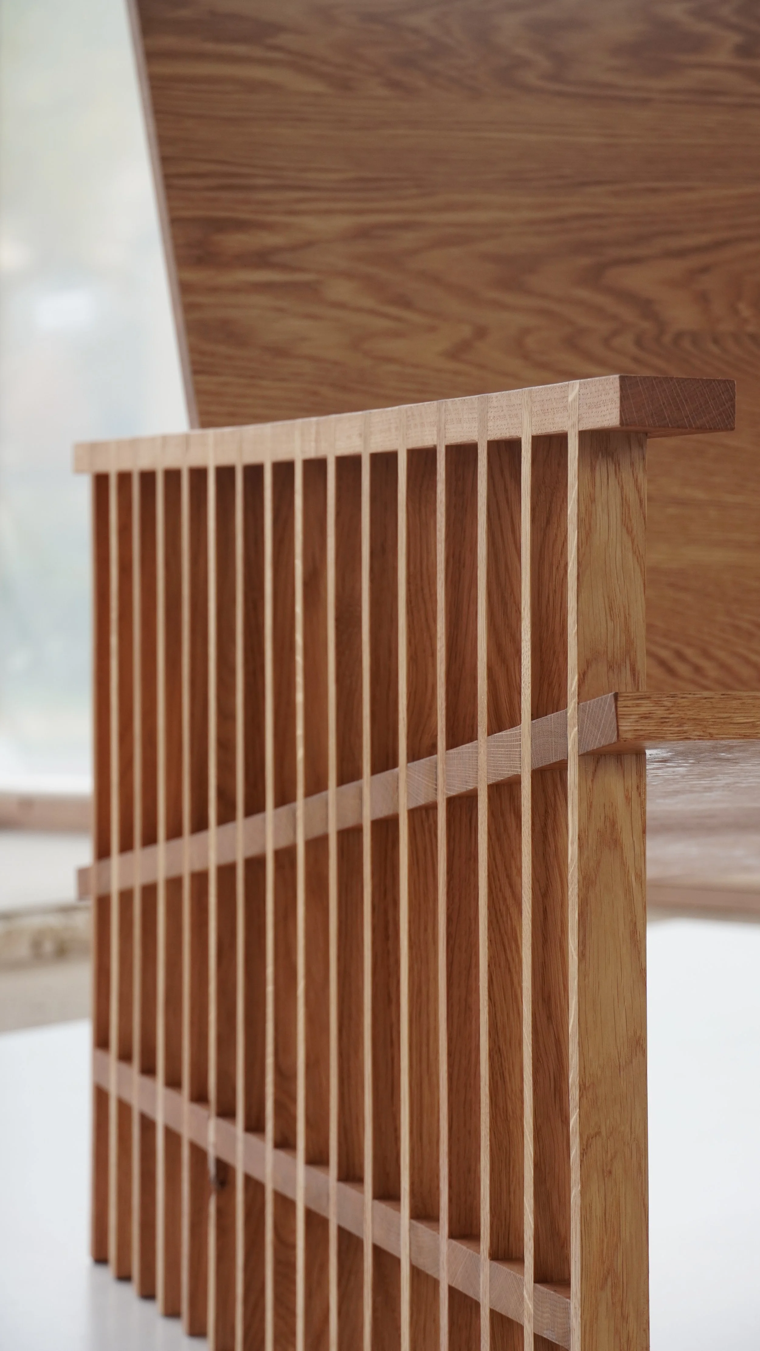 Een sculpturale kast die de grens opzoekt tussen meubel en ruimteverdeler. Gemaakt van massief eiken met een open geweven structuur die licht en schaduw laat spelen. Transparant, ritmisch en verrassend veelzijdig — een blikvanger met een functionele ziel.